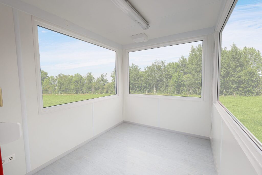 Geschikt als portierslogeDeze compacte kantoorunit biedt een praktische oplossing voor situaties waarin een kleine werkruimte nodig is. Door het overzichtelijke formaat is de unit ook zeer geschikt als portiersloge of ontvangstpunt bij een terrein of ingang.