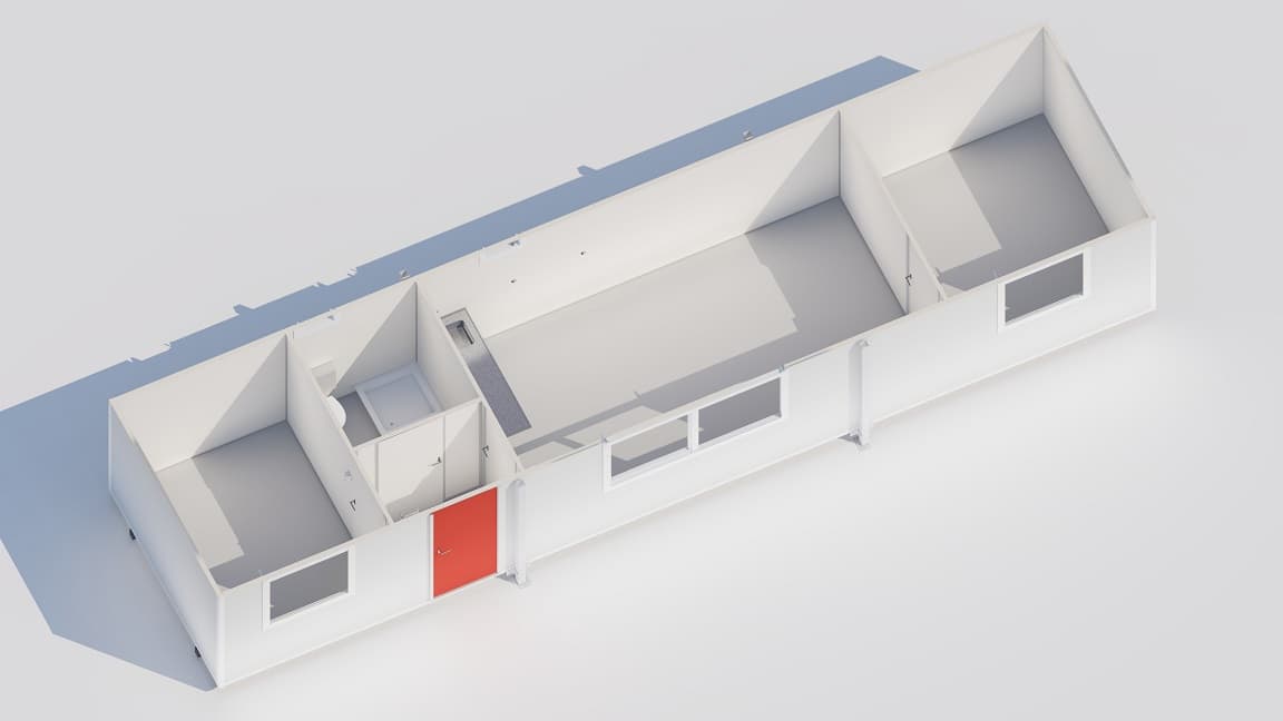 Zelfstandige woonruimteDeze compacte woonunit bestaat uit één unit met meerdere ruimtes en biedt een praktische oplossing voor tijdelijk verblijf. De unit is ingericht met afzonderlijke kamers, een keuken en sanitair, waardoor een zelfstandige woonruimte ontstaat.